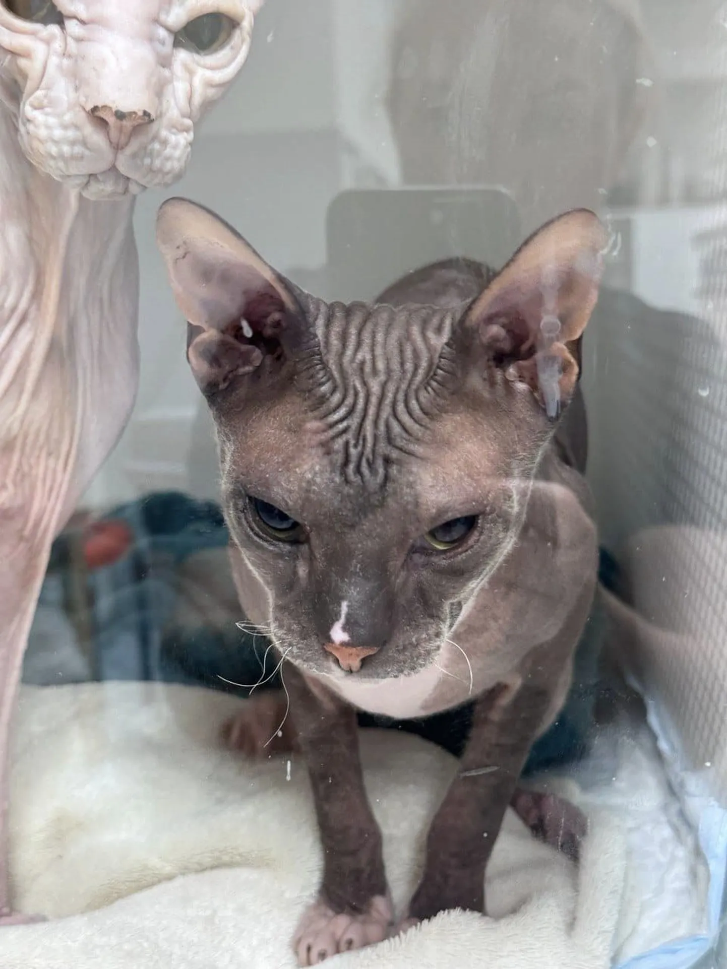 Kasside puurist õhkus hingematvat uriinihaisu ehk ilmselt olid nad seal pidanud olema juba pikemat aega. Kassid olid täiesti lääbakil ning väga kehvas konditsioonis. Omanik oli kassidele kaasa pannud isegi passid, kust saadi teada, et tegu on 2- ja 14-aastase kassiga. Kassidel oli küll kiip, kuid registreerimata.